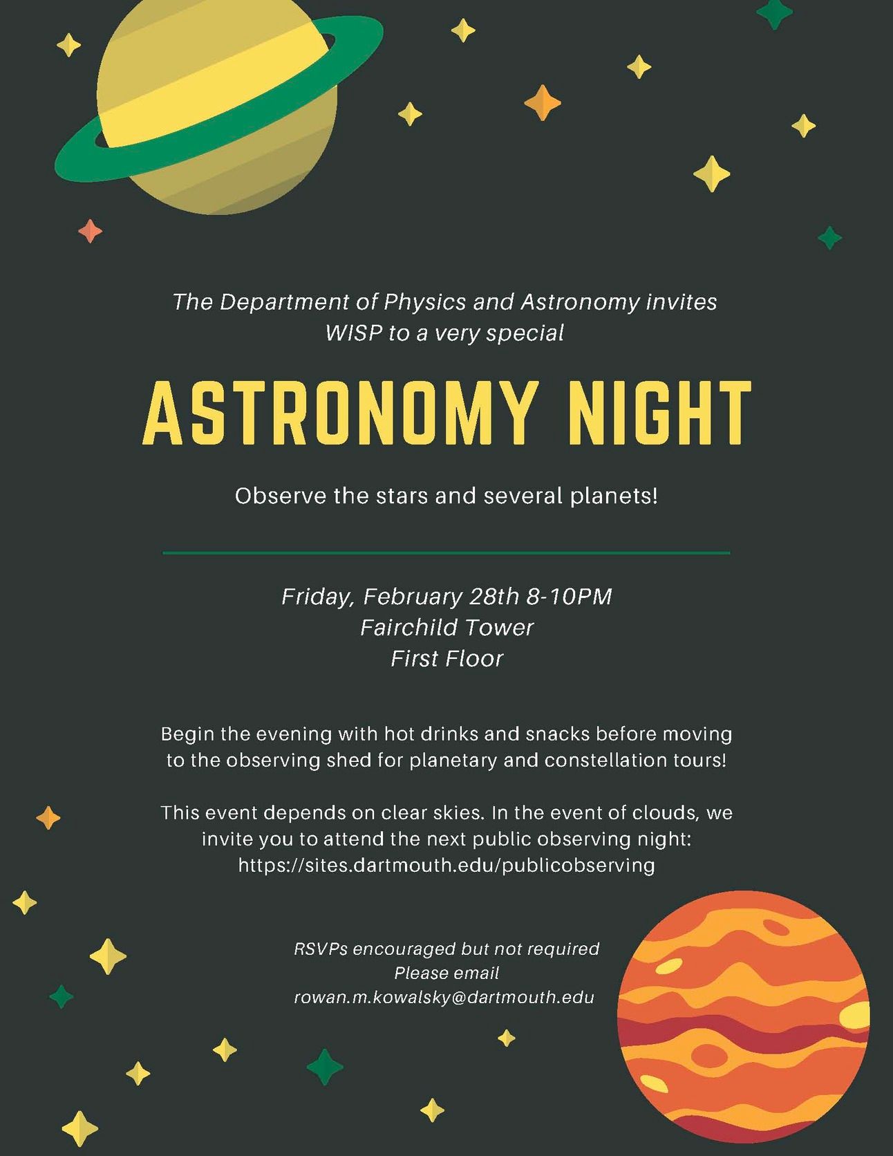 Our friends in Physics & Astronomy have graciously offered to host a party for the stars! Well, for seeing the stars, anyway. February has some extraordinary astronomical events, culminating in a planetary alignment on Feb 28. Join us for food and drinks on the first floor of Fairchild before moving to the observing shed to take a guided peep at the night sky. If the weather is too cloudy to permit good viewing, we will reach out to let you know about a raincheck.
